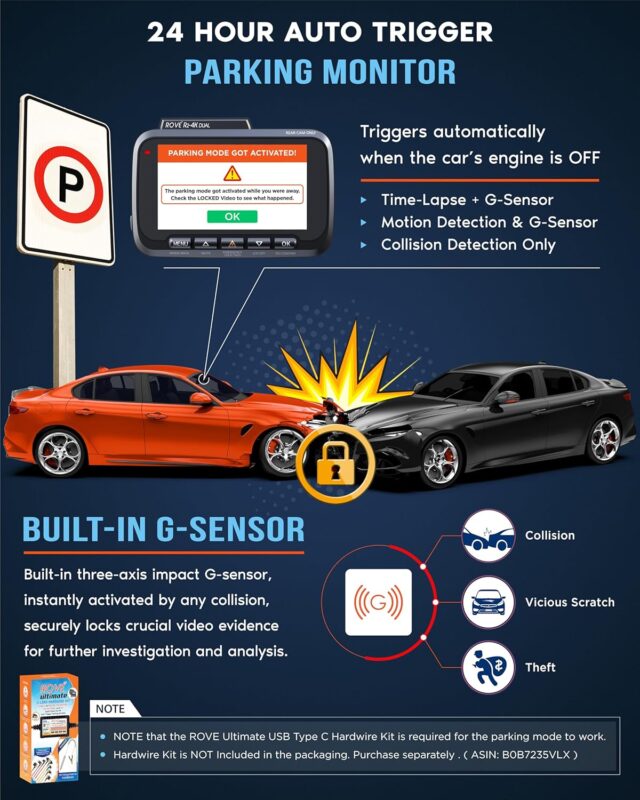 • 24-Hour Parking Monitoring: Protect your vehicle with time-lapse recording and G-sensor detection to monitor potential damage or theft. The car dash cam supports time-lapse video mode, recording continuously for 24 hours at a low frame rate and low power consumption, capturing one frame per second. When the vehicle is parked, any collision event will automatically trigger recording and lock the video. Please note: A separate hardwire kit is required for parking mode