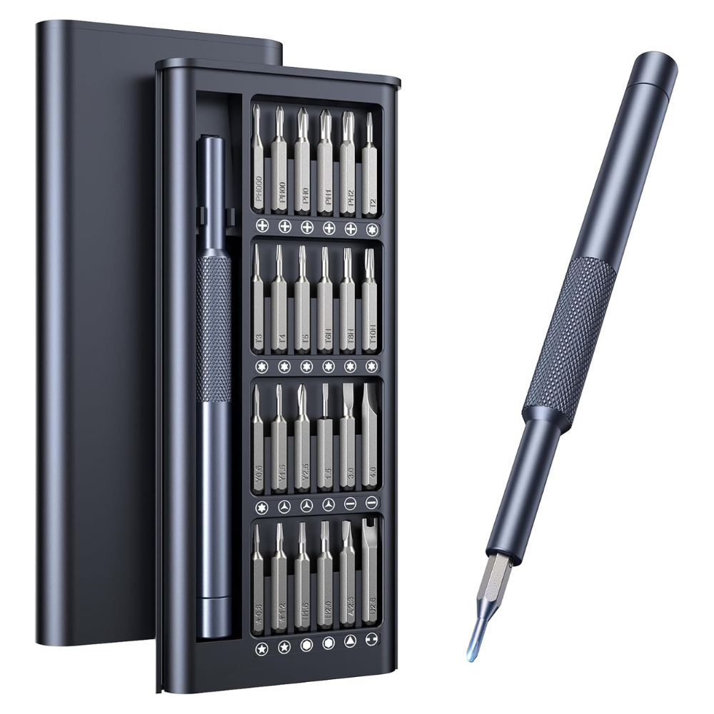 - [25in1, Household Must-Have] The small screwdriver set comes with 24 different bits (Phillips, Flat, Torx, Torx Security, Pentalobe, Hexagon, etc.), ensuring you have the smallest but complete set of repair kit.