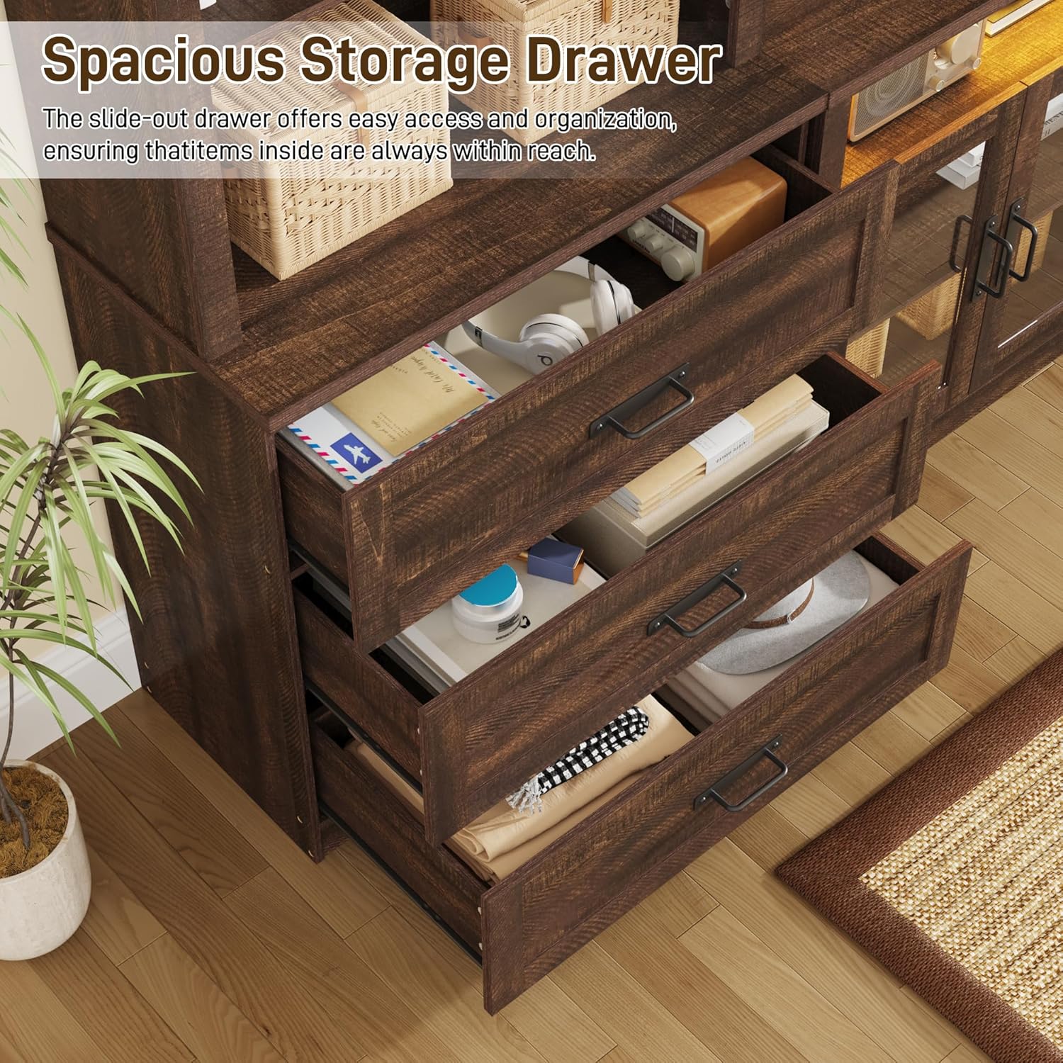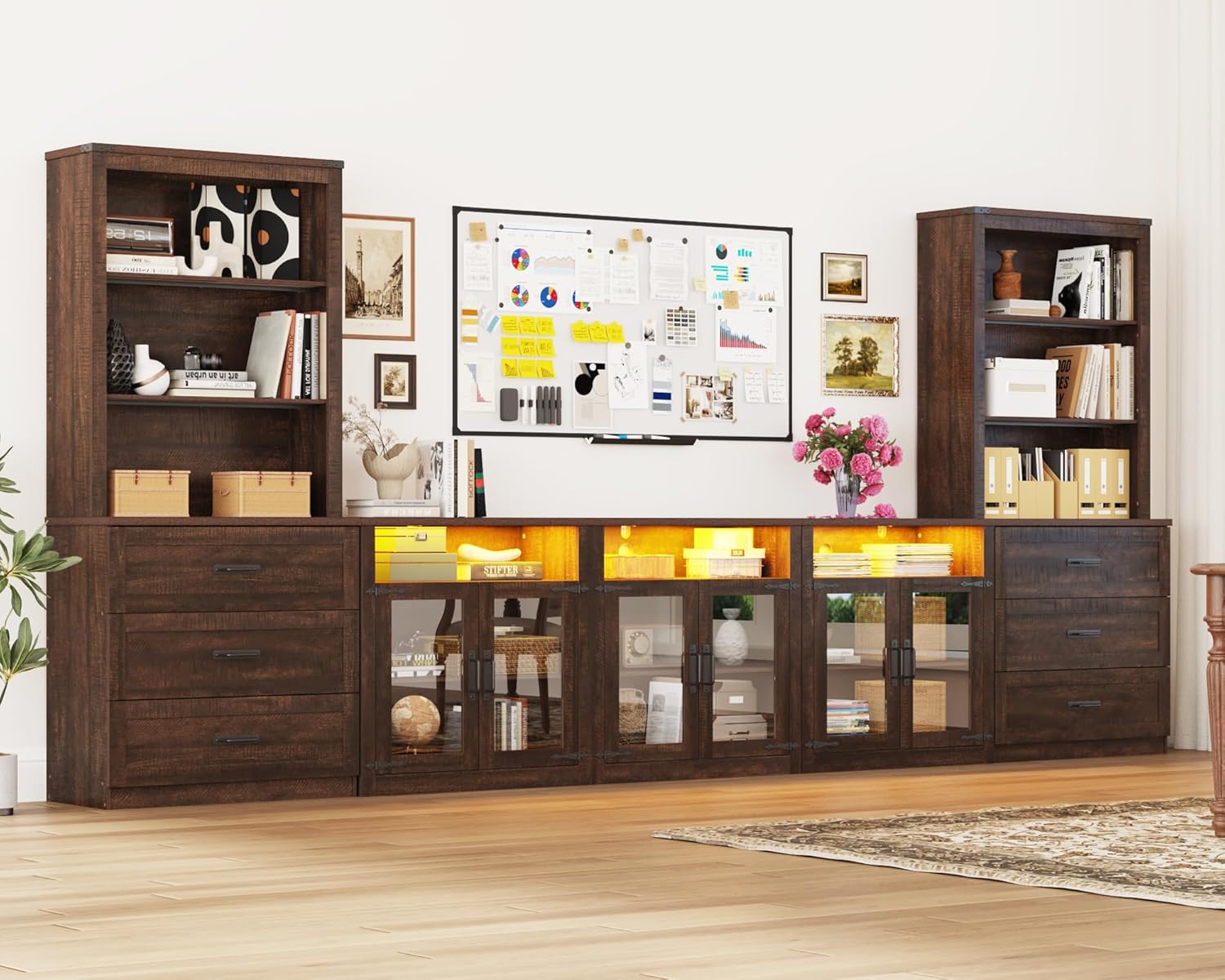 - Massive Storage Capacity – This wall unit TV stand comes with one 4-door cabinet, one 2-door cabinet, and two bookcases, can be used in combination or separately. There are total 15 shelves and 6 drawers, accommodating various items, including large TVs and entertainment devices, books, or decor. The TV console allows you to keep your belongings organized and within reach.Wide 94.5 inch tabletop, perfect for your 100 inch TV.