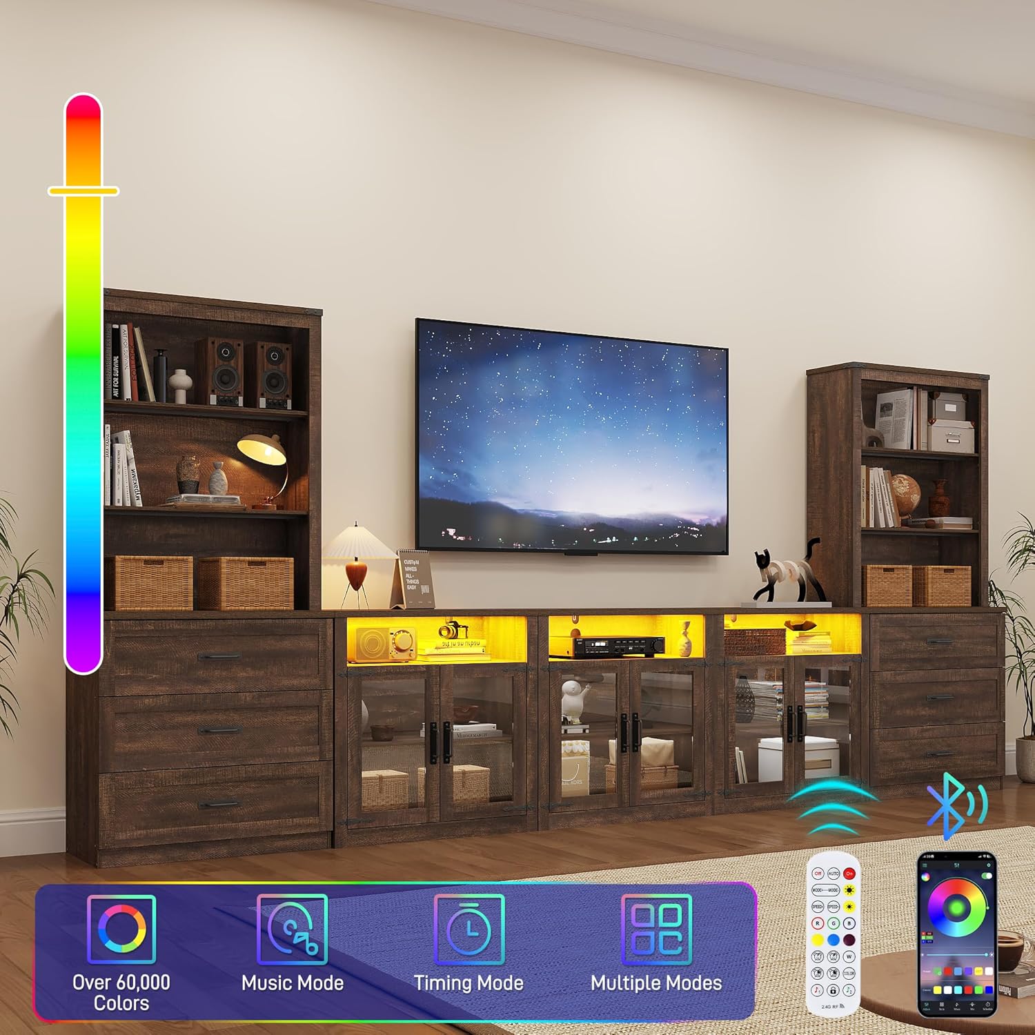 - Customizable LED Lighting Effects – This TV Media Console is equipped with LED lights that offer variable colors. You can choose the various lighting effects you desire using a remote control or mobile app. Not only does it enhance the ambiance of your living room, but it can also serve as a night light, illuminating the darkness.