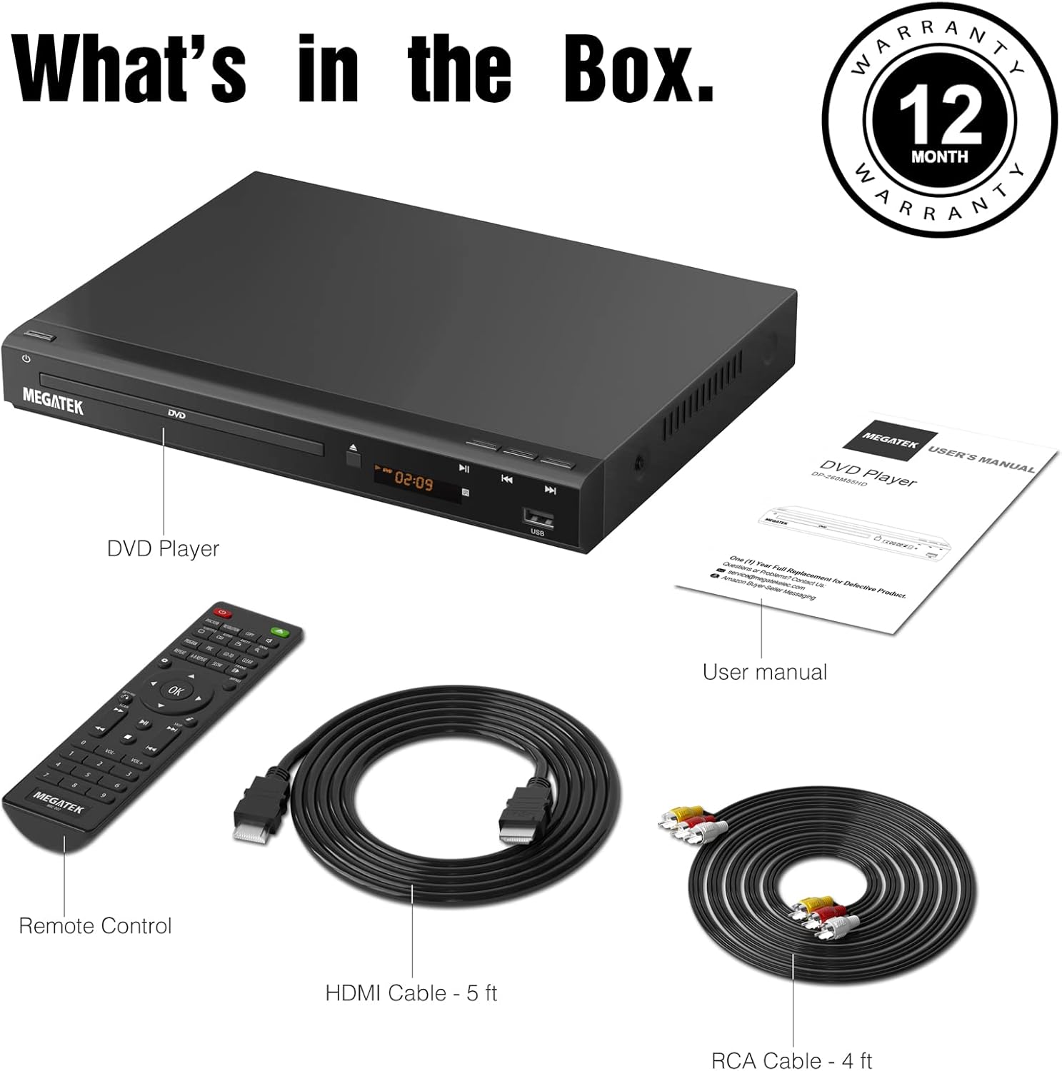 - Multi-Format Compatibility – Supports video discs including DVD, DVD+R/R DL, DVD+RW, DVD-R/R DL, DVD-RW, SVCD, VCD; audio discs including CD, CD-R, and CD-RW; plus MP3, WMA, and JPEG file formats. Note: Not compatible with Blu-ray discs.
